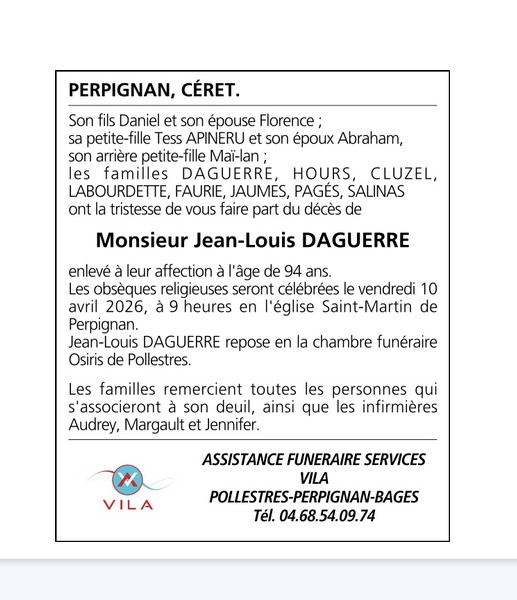 C’est avec une grande tristesse que nous vous annonçons le décès de Jean-Louis DAGUERRE survenu le dimanche 05 avril 2026 à Perpignan. La cérémonie se déroulera le vendredi 10 avril 2026 à 09h00 à l’adresse suivante : Église Saint-Martin - 12 Rue Alart Julien Bernard - 66000 Perpignan.