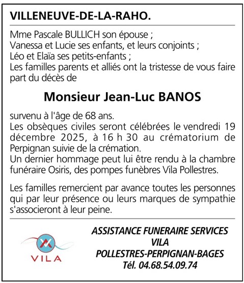 C'est avec une grande tristesse que nous vous annonçons le décès de Jean-Luc BANOS. La cérémonie se déroulera le vendredi 19 décembre 2025 à 16h30 à l’adresse suivante : Crématorium de Perpignan - 699, rue Louis Mouillard - 66000 Perpignan.